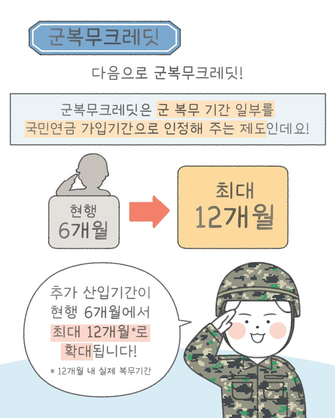 • 군복무 크레딧: 기존 6개월 → 최대 12개월까지 확대 (2026년 이후 복무자부터 적용)