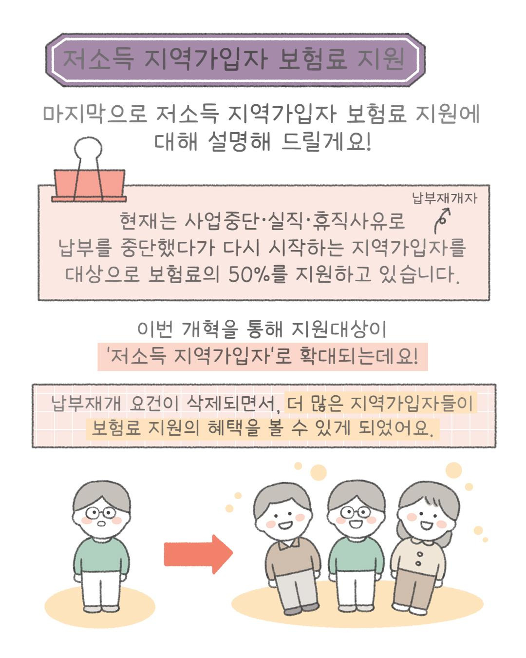 • 저소득 지역가입자 보험료 지원: 납부 예외자뿐 아니라 저소득층까지 지원 확대
